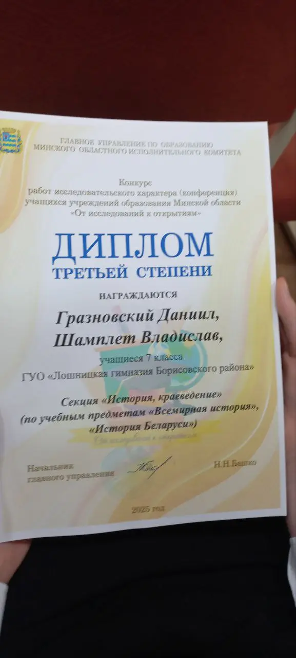 Гразновский Даниил, Шамплет Владислав, учащиеся 7 "А" класса, секция "Краеведение. История"