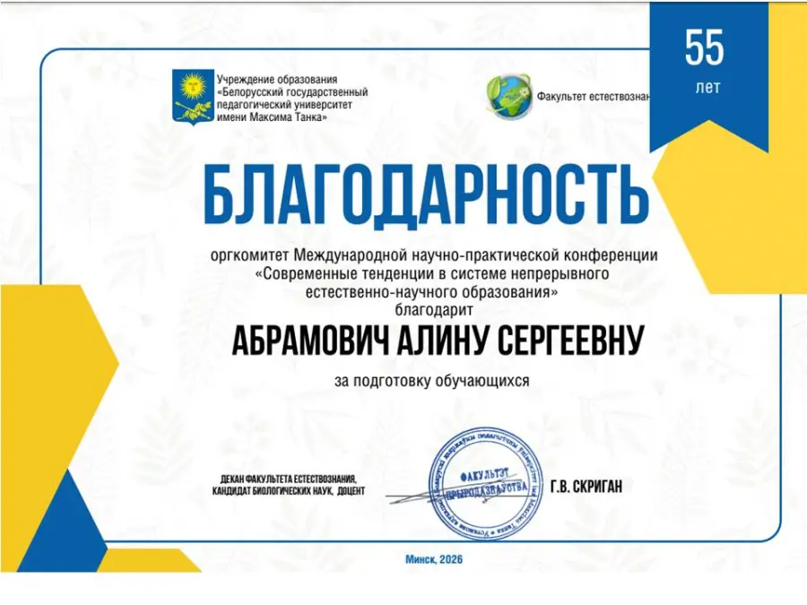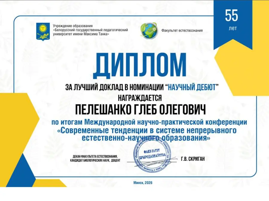 👏 Дипломом «За лучший доклад» награжден Глеб Пелешанко, учащийся 9 «А» класса (научный руководитель – Алина Сергеевна Абрамович, учитель биологии).