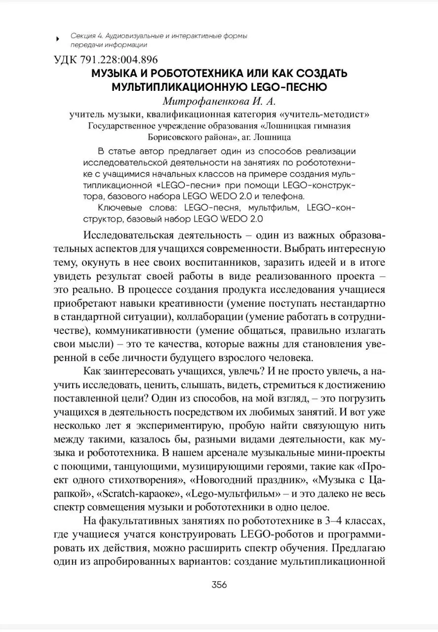 На страницах сборника научных статей "Теория и практика становления информационной культуры личности в мире и в Беларуси " об использовании элементов музыки и робототехники рассказывает учитель музыкальных дисциплин Ирина Арсентьевна Митрофаненкова.
