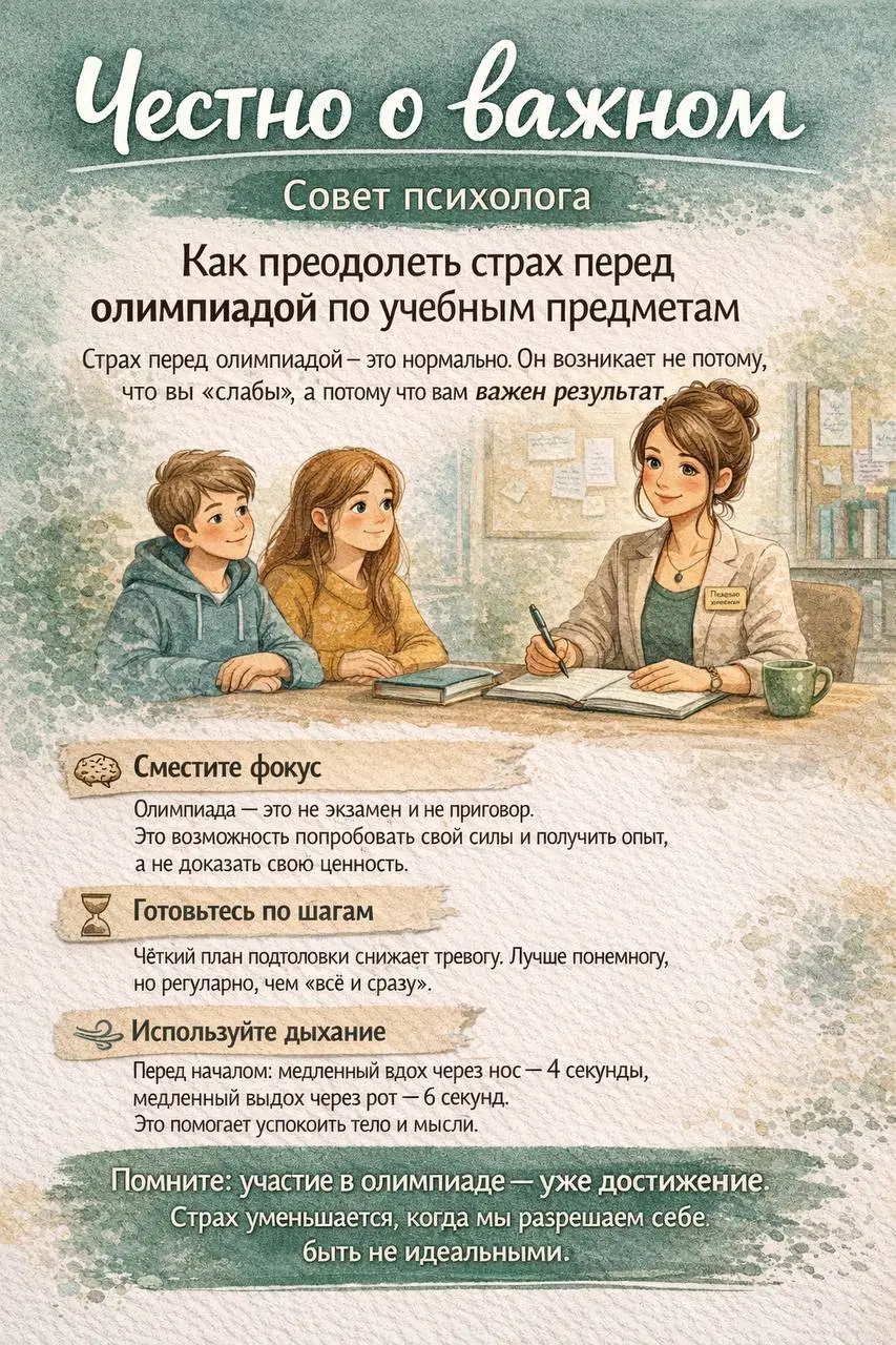 ✨ Помните: участие в олимпиаде - уже достижение. Страх уменьшается, когда мы разрешаем себе быть не идеальными.