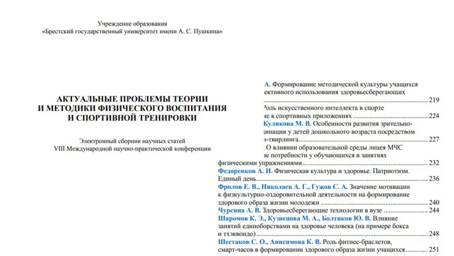 В сборнике материалов VIII Международной научно-практической конференции "АКТУАЛЬНЫЕ ПРОБЛЕМЫ ТЕОРИИИ МЕТОДИКИ ФИЗИЧЕСКОГО ВОСПИТАНИЯ И СПОРТИВНОЙ ТРЕНИРОВКИ"