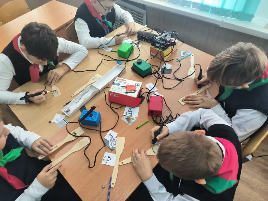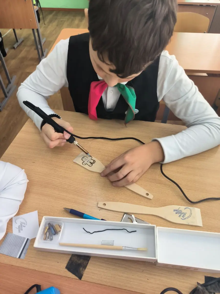 С осторожностью и сосредоточенностью пятиклассники водили раскаленным жалом по контурам, создавая неповторимые узоры. С каждым движением проявлялся задуманный рисунок, наполняя кабинет ароматом жженого дерева.