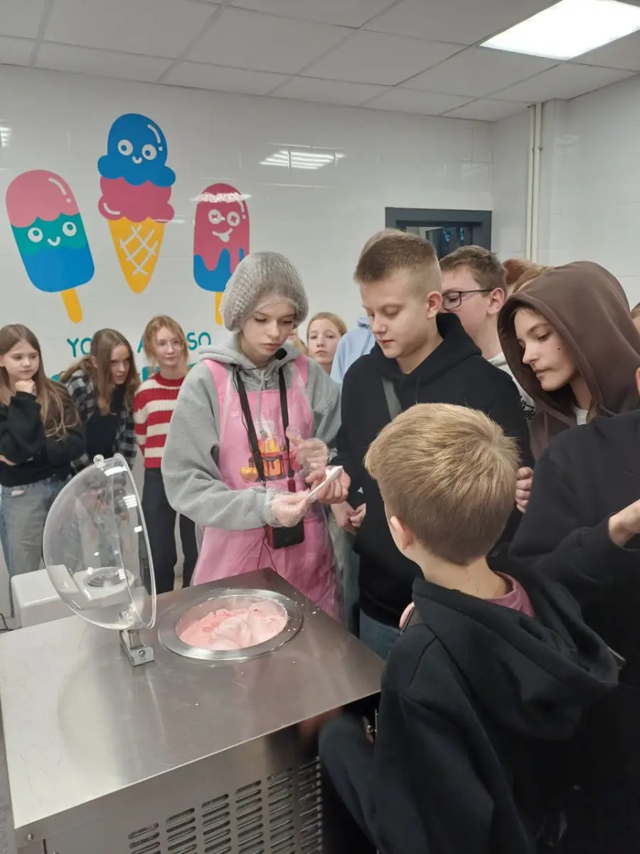 Гимназисты 7 классов посетители музей и начали свое путешествие с интерактивной экскурсии, где им рассказали об истории возникновения мороженого и сладостей, как развивались рецепты мороженого и как сладости завоевывали популярность по всему миру. Исторические факты и занимательные истории оживали на экране во время познавательного фильма.