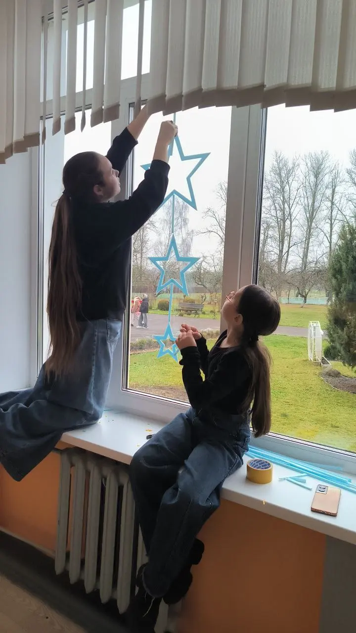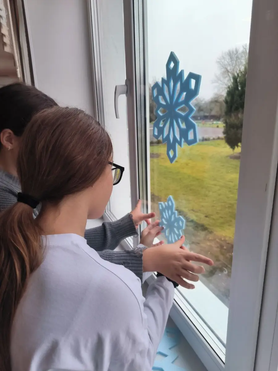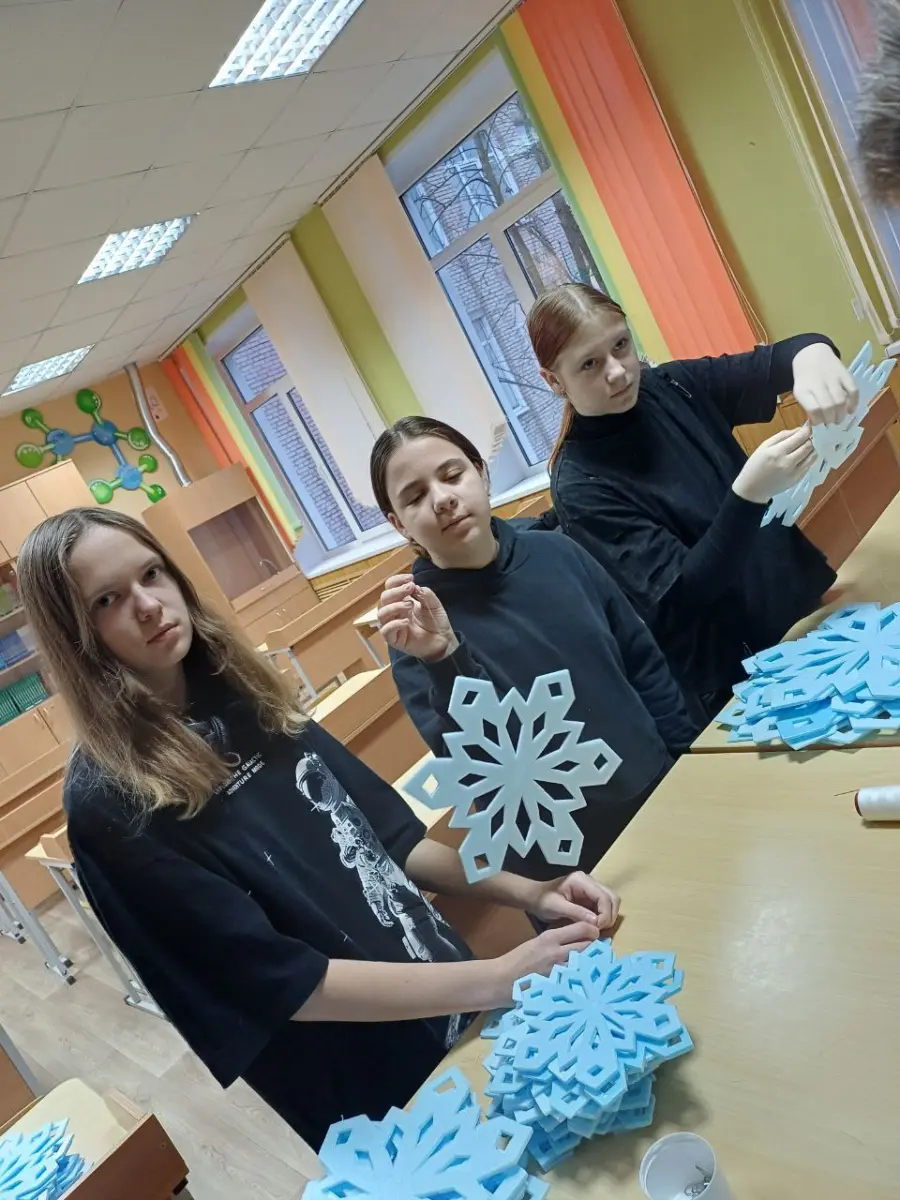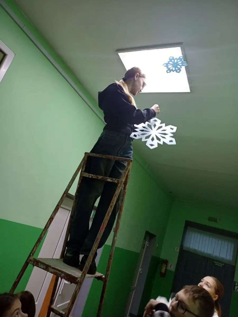 Нет ничего прекраснее, чем смотреть на снежинки, вырезанные руками гимназистов: кто-то создаёт замысловатый узор, кто-то - символ Нового года, а кто-то - силуэт ёлки. Свет от гирлянд играет на стекле, а на улице кажется, что гимназия светится изнутри.