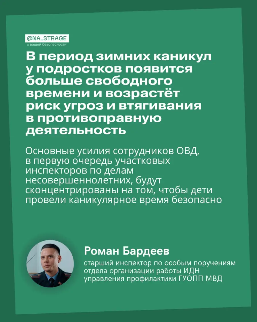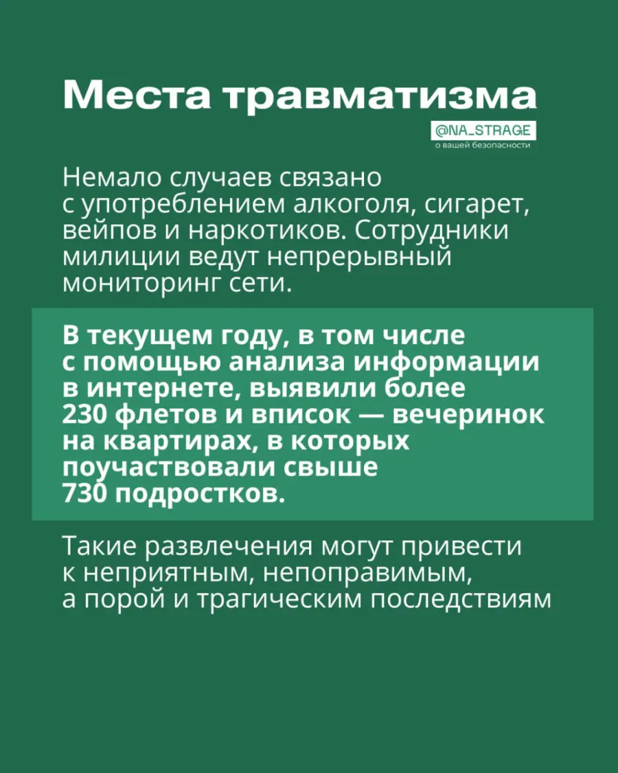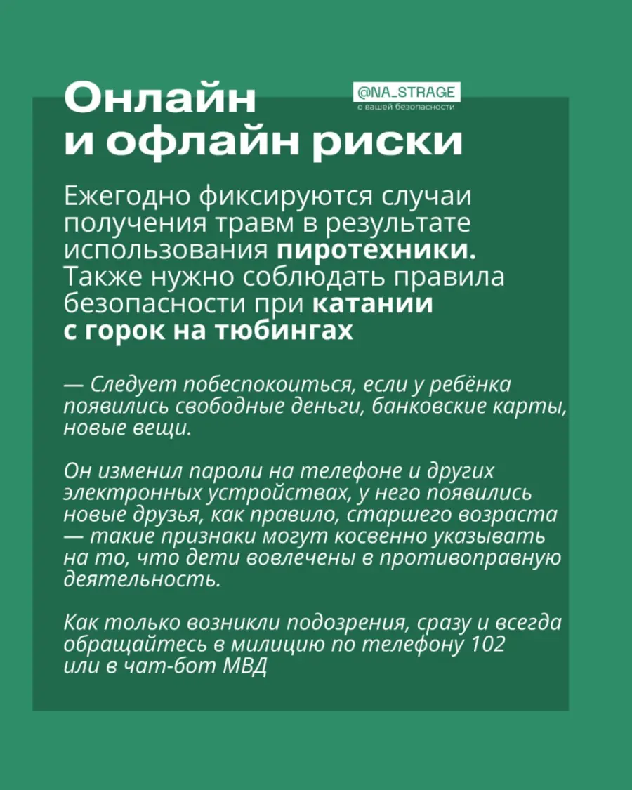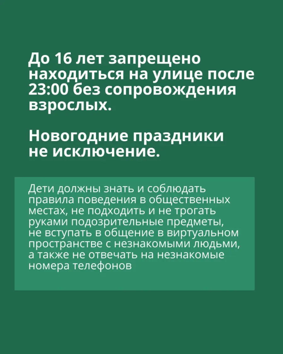Не стоит забывать и о простых, но важных правилах: после 23:00 несовершеннолетним нельзя находиться на улице без взрослых, нельзя трогать подозрительные предметы, использовать пиротехнику и соглашаться на сомнительные «вписки».