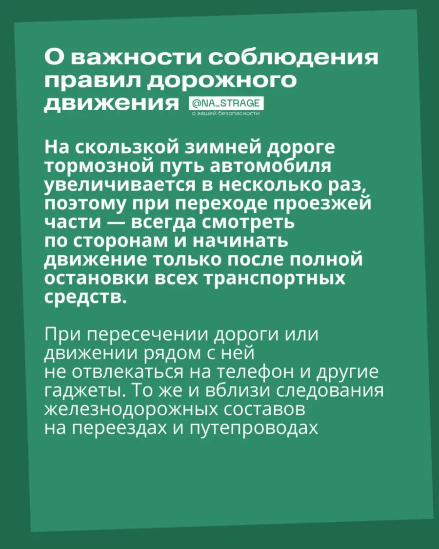 Дороги становятся скользкими, а тормозной путь автомобилей увеличивается. Поэтому важно напоминать детям: никакие наушники и телефоны не важнее внимательности при переходе улицы. Во дворах, на горках и тюбингах - тоже только по правилам безопасности.